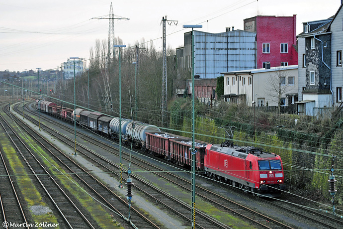 Als Beifang konnte am 06. Februar 2016 die 185 040 mit einem gemischten Güterzug unter der großen Stützmauer von der Fußgängerbrücke an der Reichsbahnstraße im Bezirk Vof abgelichtet werden. Nach zwei Kilometern Fahrt hat sie ihr Ziel, die Einfahrgruppe im Bezirk Vwf erreicht.