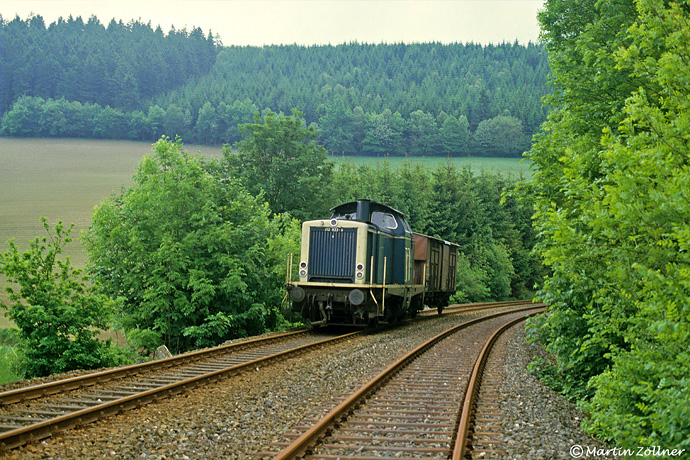 Der Dunst am 30. Mai 1986 löste sich den ganzen Tag nicht auf. So musste an der Parallelführung der Strecken nach Schmallenberg und Eslohe in Wenholthausen bei der nach Neheim-Hüsten mit einem leeren Saatkartoffelwagen zurückkehrenden Übergabe auch hier auf ein Sonnenbild verzichtet werden.