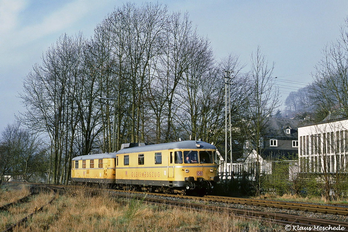 Am 18.April 1998 war der Gleismesszug 004 auf der Rothaarbahn unterwegs. An der Südeinfahrt in Hilchenbach fand Klaus Meschede ein sonniges Plätzchen, um bei der Vorbeifahrt an den dominierenden, hohen Bäumen diese Aufnahme anfertigen zu können.