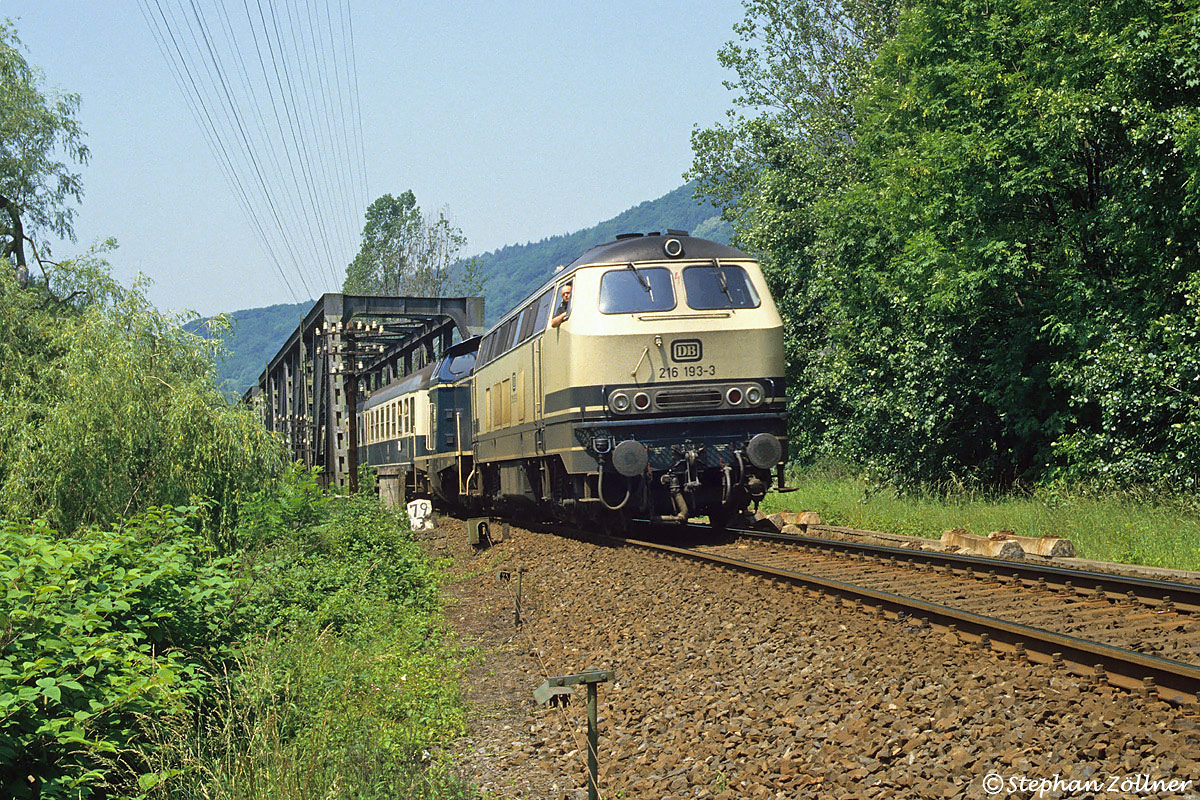 Auf der Lahntalbahn von Wetzlar nach Koblenz waren Mitte der achtziger Jahre sowohl Loks der Baureihe 216 als auch 212 ⁄ 213 im Zugdienst anzutreffen. Am heißen 16. Juni 1986 rumpeln 216 193 und 213 340 gemeinsam am E 3763 über die Lahnbrücke in Nassau. Etwas misstrauisch beobachtet der Chef am Handrad das Treiben des Fotografen mitten in der Pampa.