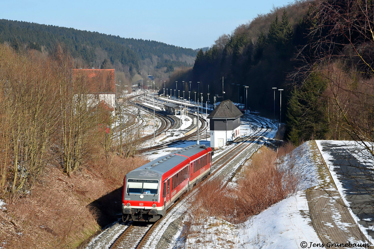 In 2018 waren bei der Kurhessenbahn die Triebwagen der Baureihe 628 noch voll im Einsatz. Am 18. Februar konnte Jens Grünebaum von der Brücke der B 251 in Brilon Wald aus gleich zwei davon aufnehmen, wobei nur 628 228 in Fotosonne nach Brilon Stadt fahrend die Rampe von Willingen herunter an den Bahnsteig kullert.