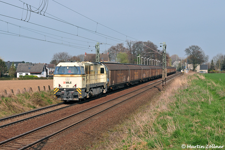 Am 28. März 2014 hat Stammlok WLE 21 im Lippstädter Güterbahnhof den Spanplattenleerzug von Dänemark zum Eggerwerk übernommen. Während die meisten Güterzüge ab Soest auf Hamm ⁄ Abzw Gallberg laufen, nimmt die "Spanplatte" den direkten Weg über Werl. Nach Durchfahren des Haltepunktes Lünern wird dort in der Nachmittagssonne umgehend der Kameraverschluss ausgelöst.
