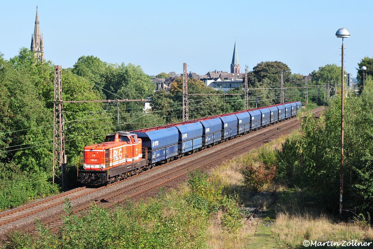 Am 27. September 2013 wurde dem Leerkohlezug von Neheim-Hüsten zum Dortmunder Hafen aufgewartet. In dieser Periode bestand der Wagenpark aus blauen, angemieteten VTG Falns-Wagen. Die Deutzlok RLG 68 -fotogerecht mit langem Vorbau voraus- hat soeben den Bahnhof Hörde hinter sich gelassen und rollt die Gefällestrecke zur Westfalenhalle herunter, als von der alten Hoesch-Werkbahnbrücke die digitale Spiegelreflexkamera ausgelöst wird. Die Lutherkirche (links) und die Stiftskirche St. Clara (rechts) dienen dabei als Landmarken.