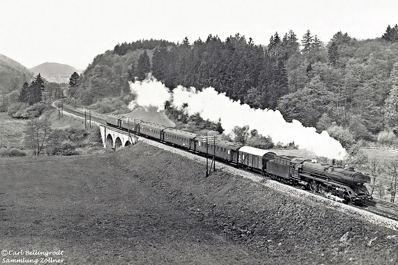 Km 242,850 Brilon Wald, Stadtwaldbrücke am HammerkopfAls Carl Bellingrodt am 17. Februar 1952 die gerade seit 6 Wochen beim Bw Warburg beheimatete 38 1828 mit einem Personenzug von der Brücke am Hammerkopf im Tiefschnee aufnahm, war das alte Bahnwärterhaus dort noch vorhanden und sogar bewohnt, wie der vor der Haustür geräumte Schnee beweist.