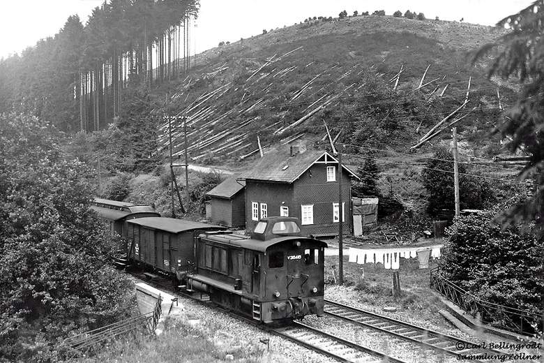 Die Wehrmachtsdiesel der Baureihe V 36 wurden überwiegend im Rangierdienst der Bahnwerke sowie für Bauzüge eingesetzt. Carl Bellingrodt hielt sich mit seiner Kamera am 30. Juli 1962 im Bereich der Stadtwaldbrücke bei Brilon Wald auf. Wohl zufällig kam ihm dabei die Wuppertaler V 36 416, eine Maschine mit Dachkanzel, samt einem Arbeitszug am Bahnwärterhaus gen Bestwig fahrend vor die Linse. Genau zu dieser Zeit wurde am dortigen Hammerkopf ein Kahlschlag durchgeführt und auch die Bewohner hatten ihre Wäsche gerade zum Trocknen nach draußen gehängt.