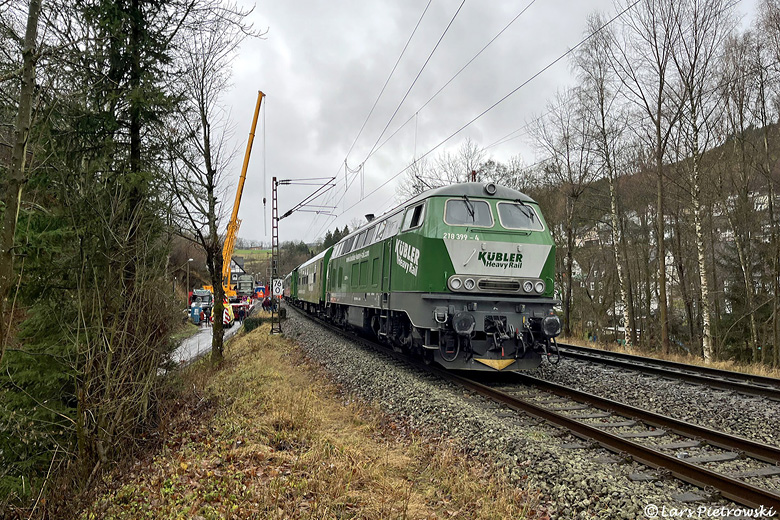 Deshalb sperrte man die Bahnlinie vom 06.12.2025, 22:30 Uhr bis 07.12.20025, 22:30 Uhr zwischen Welschen Ennest und Altenhundem, woraufhin Schienenersatzverkehr bestand. Der Zug wurde dann auf freier Strecke in Höhe des Haltepunktes Kirchhundem im Talgleis geparkt, der Trafo aus den Tragschnäbeln gelöst und im Querverschub auf einen Selbstfahrer umgeladen.