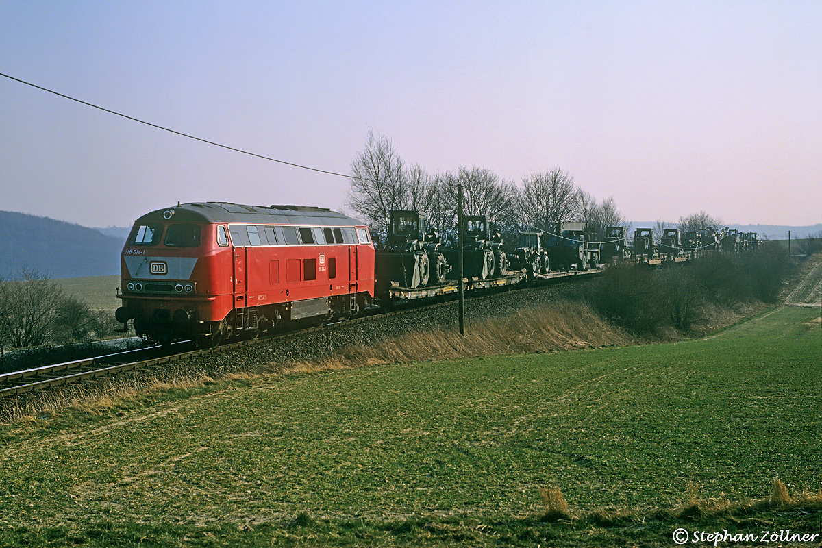 Der Streckenabschnitt Unna Industriepark – Fröndenberg wies in den neunziger Jahren planmäßig keinen Güterverkehr auf. Sehr selten verkehrten hier Umleiterzüge oder Sonderleistungen. Am 21. Februar 1994 wurde über diese Linie ein Militärtransport mit Lademaßüberschreitung abgewickelt. Die Oberhausener 216 014 zog den Dgmv 91226 von Hemer nach Unna, befördert wurden diverse Radfahrzeuge, Radlader und Raupen. Die reichlich bemessene Fahrzeit nutzte der Handradbediener an der einzig dafür möglichen Stelle bei Kessebüren für einen kurzen Fotohalt zur Anfertigung dieser Aufnahme. Leider fand die Fahrt zur besten Gegenlichtzeit statt.