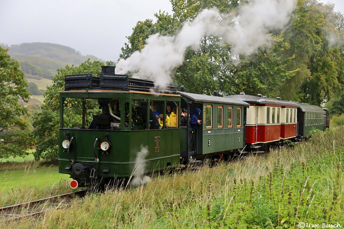 Am 05. Oktober 2025 herrschte auch im Elsetal typisches Sauerländer Mistherbstwetter. Bei der Museumskleinbahn war an diesem Tag die Kastendampflok "Rur" im Einsatz. Zusammen mit der Diesellok "Zukunft" bespannte sie die Züge zwischen Hüinghausen und dem Köbbinghauser Hammer. Uwe Busch stand am Bahnübergang in Hüinghausen und lichtete die Vorbeifahrt des Gespanns bei der Talfahrt in Richtung Köbbinghausen ab.