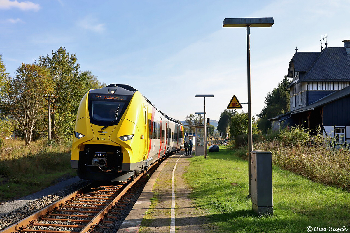 Am 02. Oktober 2025 verkehrte erstmalig ein BEMU auf der Strecke Kreuztal – Erndtebrück – Aue-Wingeshausen (wegen Brückenschäden Abschnitt Aue – Bad Berleburg längerfristig gesperrt). Der 563 801 ⁄ 563 901 der Hessischen Landesbahn (Siemens Mireo Plus B) fuhr das Zugpaar HLB 61820 ⁄ 61827 Betzdorf - Aue-Wingeshausen und zurück. Uwe Busch erwartete den HLB 61820 unter anderem in Birkelbach mit der Kamera, wie dieses Bild zeigt.
