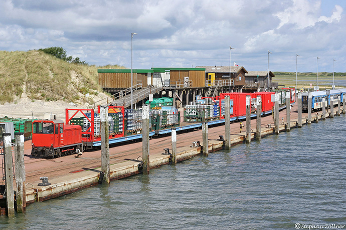 Mit der Flut ist auch das Güterschiff Harle Gatt am Wangerooger Westanleger eingetroffen. Bis auf einen Container ist die gesamte Frachtmenge bereits auf die Inselbahn umgeladen worden. 399 105, am 11. August 2010 für die Rangierarbeiten eingeteilt, wird gleich geschoben zum Inselbahnhof aufbrechen.