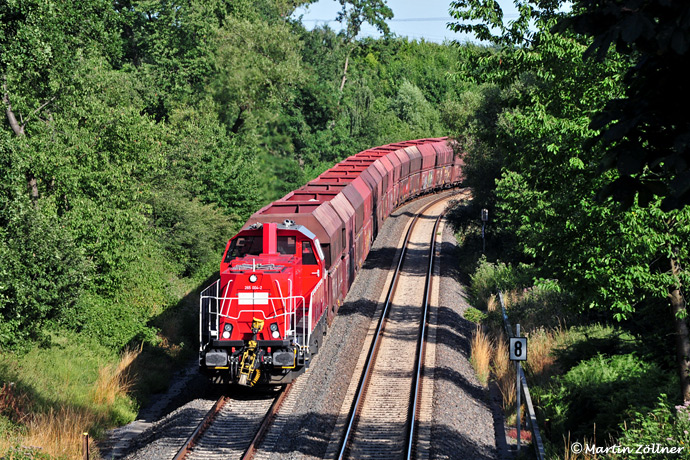 In den Sommerferien 2013 ergab sich für den Diponenten aufgrund der Anzahl abgelieferter Lokomotiven erstmals die Gelegenheit, den Rheinkalkzug der Relation Schwerte – Duisburg ThyssenKrupp-Werk mit einer der neuen Voith Gravita 15 BB zu traktionieren. Sichtlich schwer arbeitend erklimmt dann die Vorhaller 265 004 am 02. August 2013 mit dem Brocken die Steigung zwischen Abzweig Heide und dem Ostberger Tunnel.