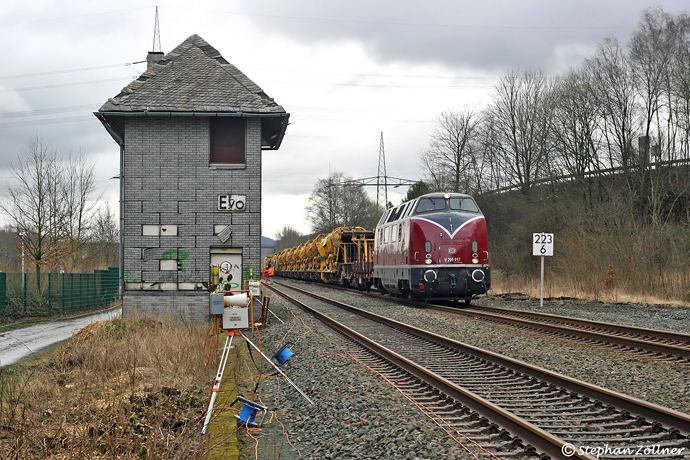 Als am 16. März 2008 die WLH V 200 017 vor dem Bettungsreinigungszug während der Erneuerung des Gleises Eversberg – Bestwig neben dem ex-Stellwerk Evo zum Einsatz kam, war dieses schon eine Ruine. 12 Jahre später, im November 2020, wurde der Schandfleck dann wegen Baufälligkeit und Gefährdung des Zugverkehrs endlich abgerissen.