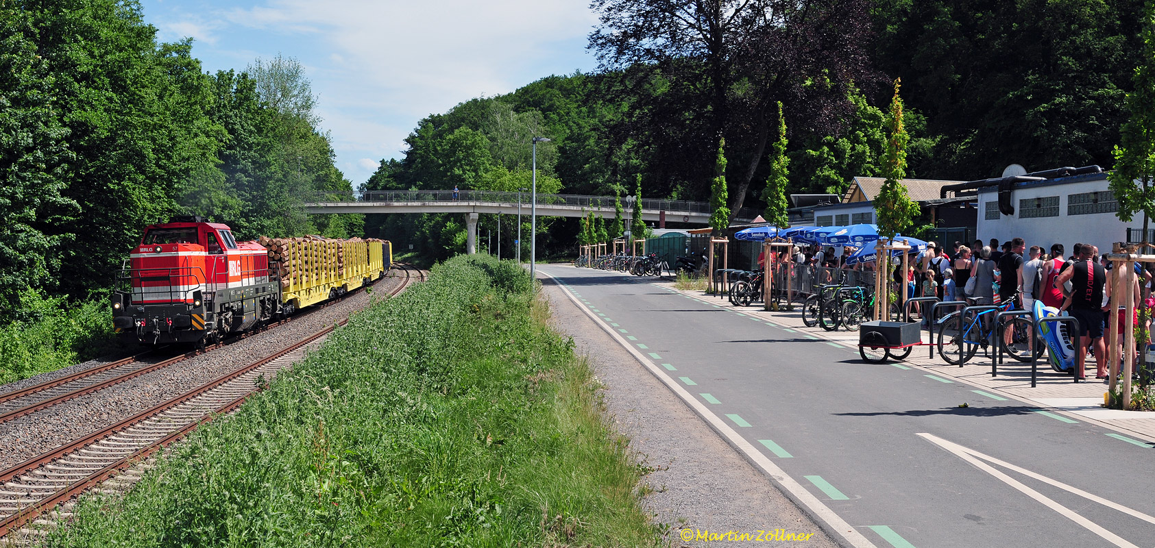Nach weitgehender Lockerung der strengen Coronaschutzmaßnahmen ist am Samstagnachmittag, den 19. Juni 2021 auch ein Freibadbesuch wieder möglich. Unbeirrt von der auf Einlass wartenden Menschenschlange (siehe 1200 x 800-Bild) beschleunigt RLG 57 am Neheimer Stadtwald ihre gelbe Borkenkäferholzschlange von Sundern kommend gen Schwerter Güterbahnhof. Diese Perspektive ist nach 40 Jahren erst seit Herstellung der neuen Fahrradstraße wieder möglich.