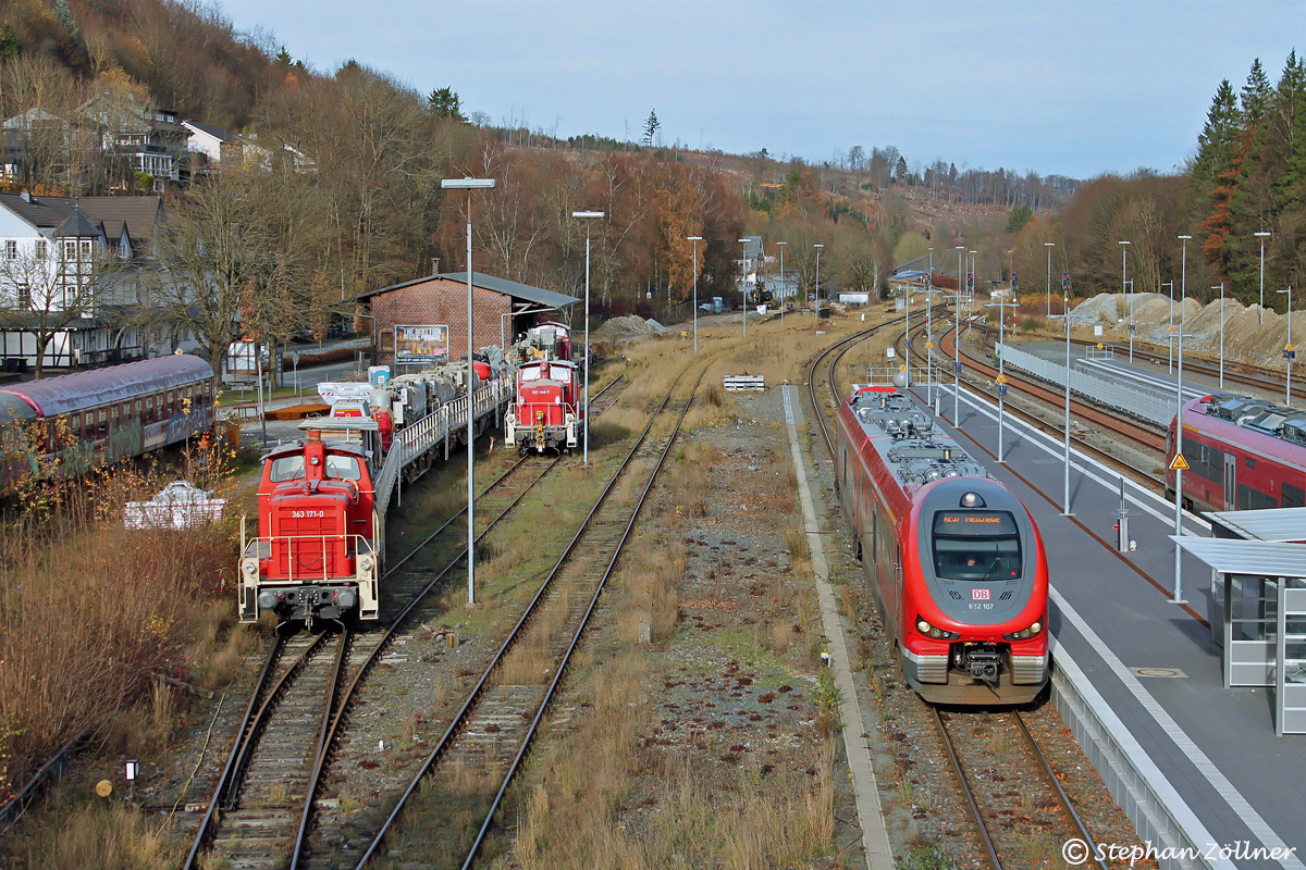 Am schlonzlichtigen 13. November 2025 wurden mal in Brilon Wald die neuen Bahnsteige inspiziert. Der nur nachtaktive Tunnelbauzug stand mit den Railsystems Loks 363 171, 363 666 und 290 008 wie üblich in der Tagesabstellung, während rechts nebenan 632 107 als RE 10978 nach Meschede gerade einfährt, aufgenommen von der ebenfalls neuen Fußgängerüberführung.
