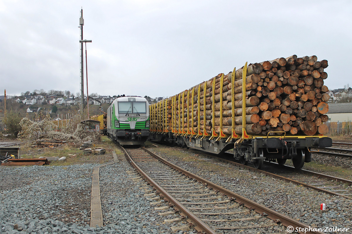 Mittlerweile ziemlich selten geworden sind Ganzzugholzverladungen an der Arnsberger Ladestraße. Am trüben 24. November 2025 war die SETG mit ihrer Vectron Dualmode 248.065 vor Ort, hier kurz vor Ladeschluss im noch abgerüsteten Zustand abgelichtet.