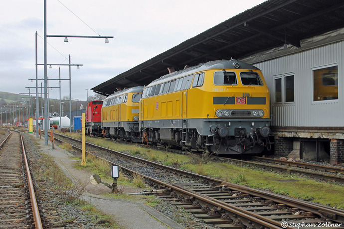 Ab dem 19. Dezember 2025 hätte der Winterdienst in Bestwig gleich auf zwei 218 zurückgreifen können. Da 218 261 zum Jahresende zu einem Termin in die Werkstatt nach Kassel abkommandiert war, kam als Ersatz 218 471 ins Sauerland und das schon ein bisschen zu früh. Aufnahme der vereint abgestellten Maschinen am Schuppen in Gleis 13 am 20.12.2025.