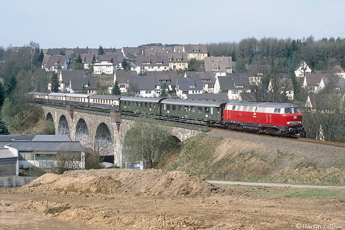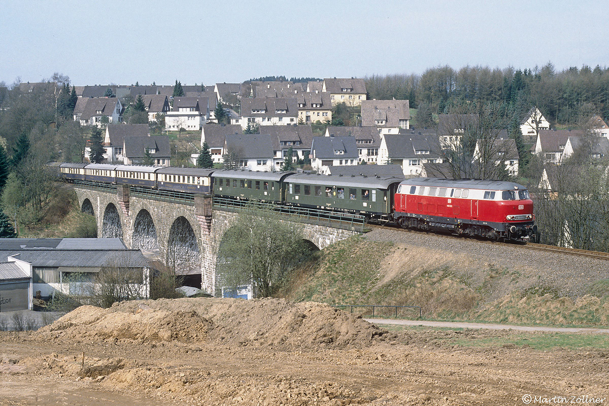Im Zuge einer großen Rundfahrt durch das Bergische Land bespannte die Museums-Lollo V 160 003 den Rheingoldzug des FEK. Auf der Route von Köln über Hagen und Brügge mit Stichfahrt nach Halver rollt der Zug hier über den Stadtviadukt von Meinerzhagen die Gefällestrecke nach Krummenerl hinunter. Im weiteren Fahrtverlauf standen noch Waldbröl und Morsbach auf dem Programm. In Meinerzhagen sind derweil schon die ersten Bauarbeiten für das Wohnbaugebiet Rügener Weg im Gange.