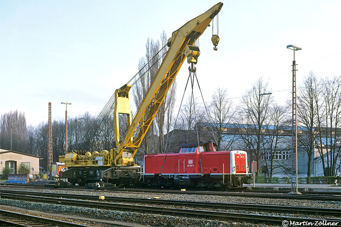 Das war in den neunziger Jahren bei jedem Bahnhofsfest der Region Standard, der Dortmunder 150 to Kran "Goliath" mit angehängter V 100 zu Demonstrationszwecken. So auch am 05. April 1992 in Menden, wo am frühen Morgen noch Aufnahmen wie diese ohne störendes Publikum angefertigt werden konnten. Kamen die Großkräne zu DB-Zeiten auch für die Gleisbauhöfe zum Einsatz, so sind zu DB AG-zeiten nur noch Notfalleinsätze vorgesehen, da alle anderen Arbeiten fremdvergeben werden.