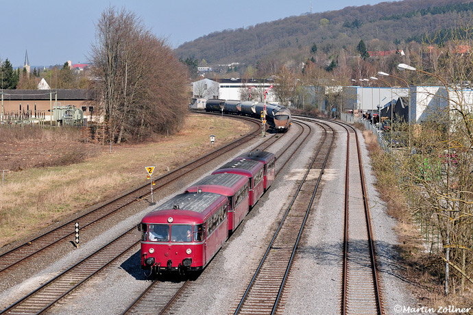 Auf Abwegen rollt die sonst auf dem linken Gleis Richtung Binolen fahrende Schienenbusgarnitur des FSB Menden am 29. März 2014 als DPE 25045 in den Rheinkalk-Übergabebahnhof Horlecke. An diesem Tag steht eine DGEG-Exkursion zum Rheinkalkwerk Oberrödinghausen auf dem Fahrtenprogramm. Unterdessen hat der Zugleiter das Einfahrtsignal aus Richtung Neuenrade für einen Doppel-640 in Stellung HP 1 gebracht.