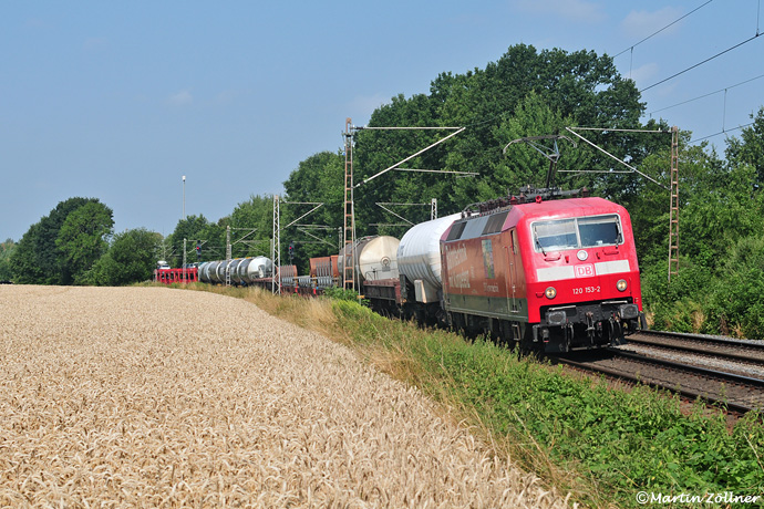Auch an Sams- und Sonntagen sind die "Innovativen Güterwagen" von DB Cargo und VTG unterwegs, um im Versuchszeitraum die anvisierte Kilometerleistung von 150.000 zu erreichen. Die Versuchsreihe wird im Auftrag des BMVI von DB Systemtechnik durchgeführt. Die Traktion übernimmt eine der beiden Systemtechnik-120ger. Am 14. Juli 2018 dreht der Zug mal wieder eine Runde von Minden über Altenbeken und Hannover und legt sich dabei elegant am Ostbusch in Welver in die Kurve.