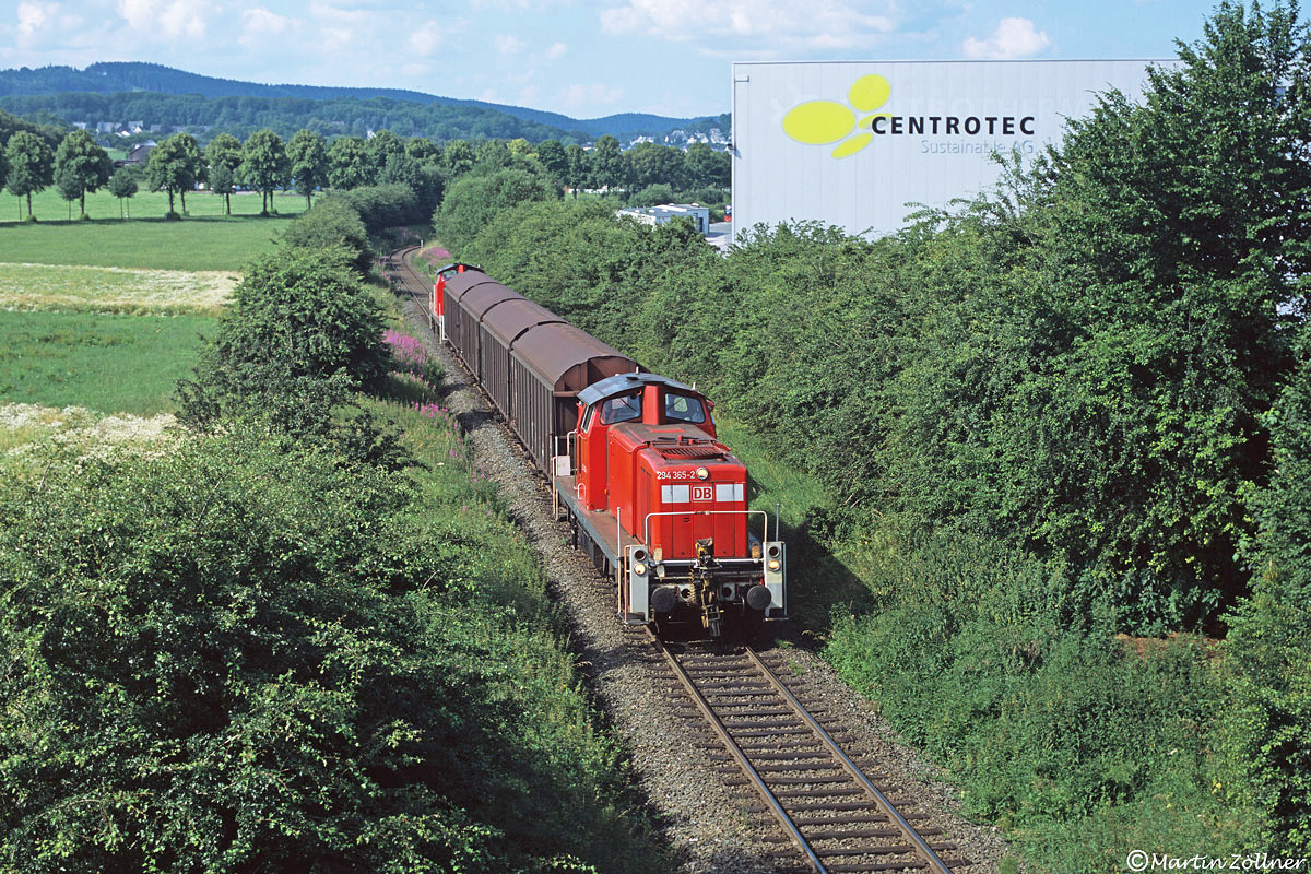 Die Beförderung des Güterzuges zum Anschluss Egger bei Brilon oblag in den neunziger Jahren den Großdieselloks der V160-Bauarten. Zum April 2002 ging die Leistung dann auf die BR 294 über, wegen der oft hohen Auslastung musste fortan aber mit zwei Maschinen gefahren werden. Zur Vereinfachung des Rangierens bei Egger reihte man jeweils eine Lok vorne und am Schluss ein. Am 13.07.2005 hätte sicherlich auch eine Maschine genügt, als CB 58469 die Anschlussweiche erreicht.