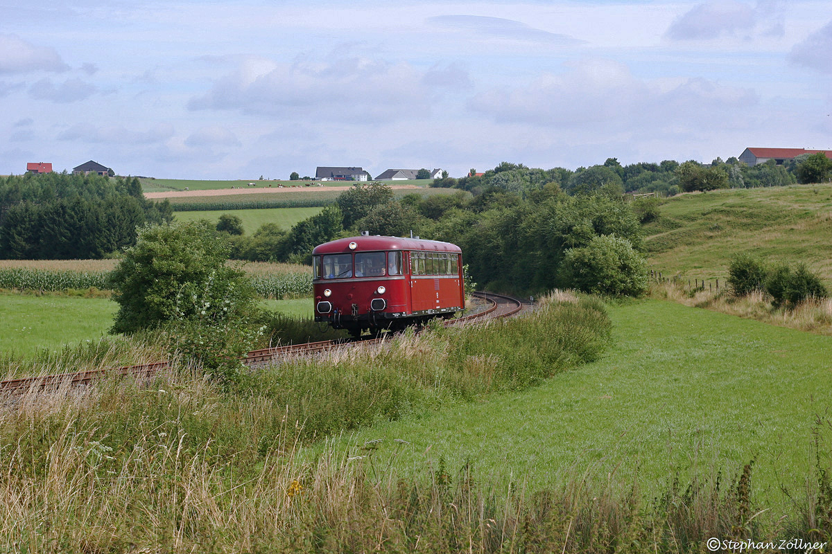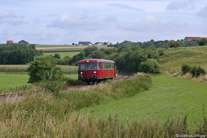Im Sommer fahren die Schienenbusse der Waldbahn Almetal e.V. an einigen ausgesuchten Wochenenden durch das idyllische Almetal zwischen Büren am Fuße des Haarstranges und der Briloner Hochfläche, wobei vom Stützpunkt Ringelstein aus entweder Thülen-Rekostein oder Büren-Weinberg erreicht wird. Am 03. August 2008 war 798 766 solo unterwegs und wird gleich nach Überqueren der Kreisstrasse 59 am Thülener Bahnsteig zum Halten kommen.