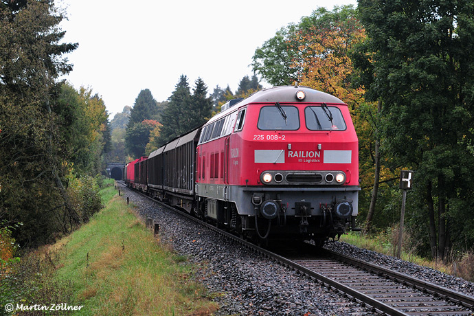Selten im Einsatz steht der MTU-Motorversuchsträger 225 008. Am verregneten 12. Oktober 2012 steht EK 54488 vom Eggerwerk nach Bestwig auf dem Dienstplan der Maschine. An der "Nachschieben einstellen"-Tafel bei Gudenhagen rollt die Fuhre zur Mittagszeit in einer Personenzugtaktlücke die Gefällestrecke nach Brilon Wald herunter.
