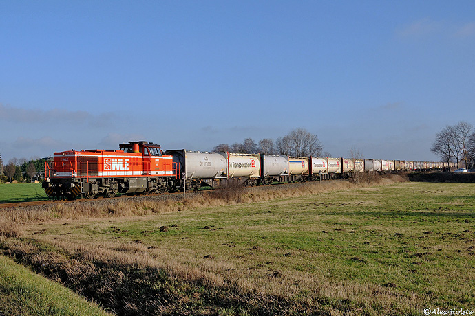Der sonntags nach Holland verkehrende Zementzug vom Geseker Dyckerhoffwerk wird seit Jahreswechsel 2012 nun von der Westfälischen Landeseisenbahn traktioniert, die zu diesem Stichtag ihre Verkehre ausserhalb des eigenen Streckennetzes ausweiten konnte. Am 15.01.2012 begegnet WLE 53 nahe des Bahnüberganges B1 bei Geseke mit dem langen Silocontainerzug Alex Holste, dem Autor der Webseite Geseke-Süd.de.