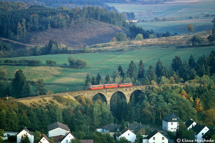 Hoch oben in der Eifel von der Burg in Daun aus hat man diesen Blick auf das dortige Viadukt der Mosel-Maare Bahn. Am Nachmittag des 16. Oktober 1981 um kurz nach halb Fünf fällt gerade noch etwas Sonne ins Lehbachtal um den vorletzten Zug des Tages an die Mosel zu beleuchten. Klaus Meschede hielt die Szene für die Nachwelt im Bild fest.
