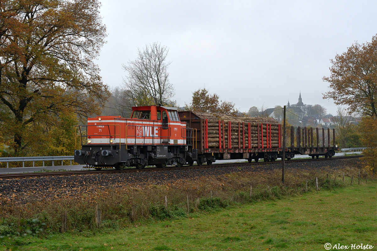 Typisches Novemberwetter gab es am 05.11.2021, als WLE 71 auf dem Weg zum Sägewerk Fisch in Altenrüthen bei Belecke Wiebusch soeben das Flüsschen "Große Dumecke" überquert hatte. Alex Holste machte ein Bild mit der Pankratiuskirche im Hintergrund.