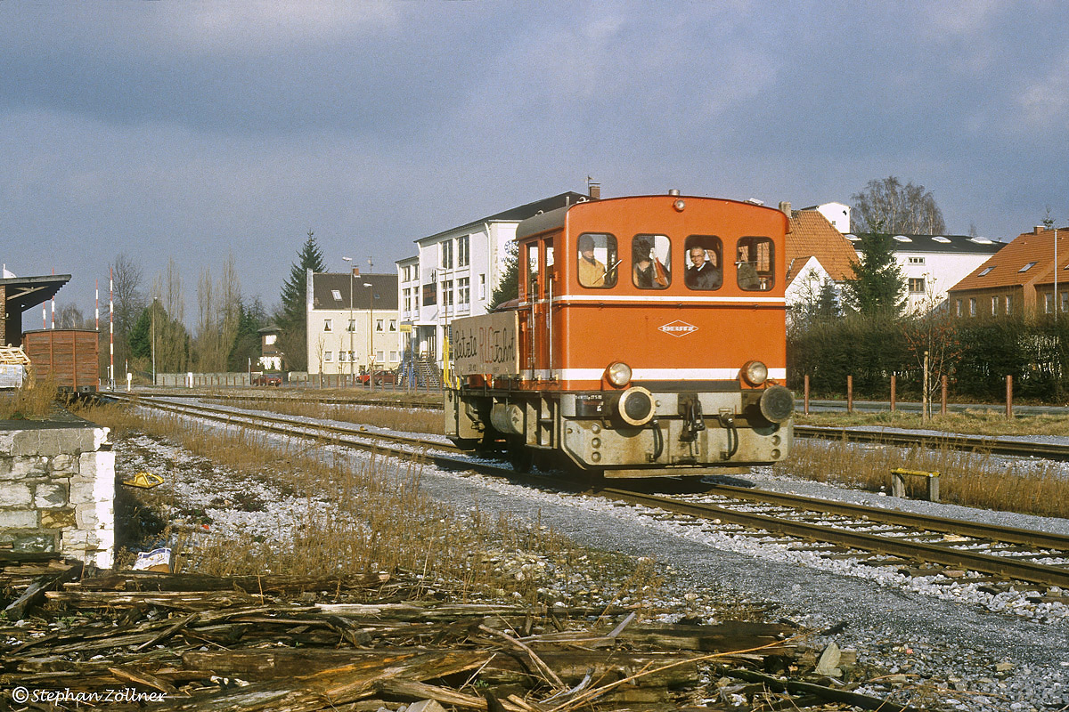 Letzmalig kommt "Biene Maja" RLG 57 am 30. Dezember 1987 vom DB-Bahnhof Soest nach Thomätor heraufgetuckert, nachdem die Wagen vom Anschluß Kunert zum Staatsbahnhof gebracht worden sind. Dies war der letzte Tag der RLG-Betriebsführung auf diesem Abschnitt der Möhnetalbahn, bis 2001 erledigte dann die Rangierlok der DB diese Bedienung mit.