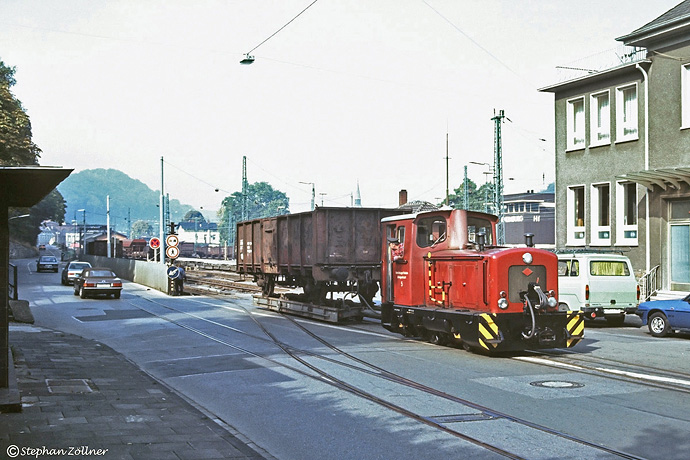Mit einem Rollwagen vom Anschluss Wälzholz ist HKB Lok 5 am Mittag des 28. September 1983 in die Lenneuferstrasse zurückgekehrt. Nachdem das Gespann bereits umfahren wurde drückt die Maschine zurück zum Abladen in die Rollgrube.