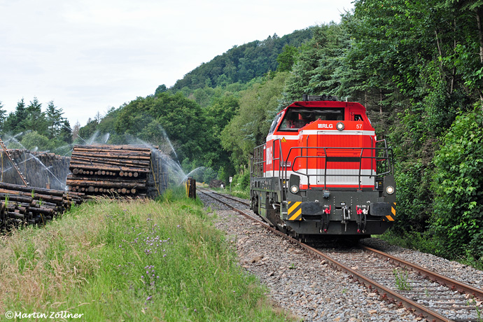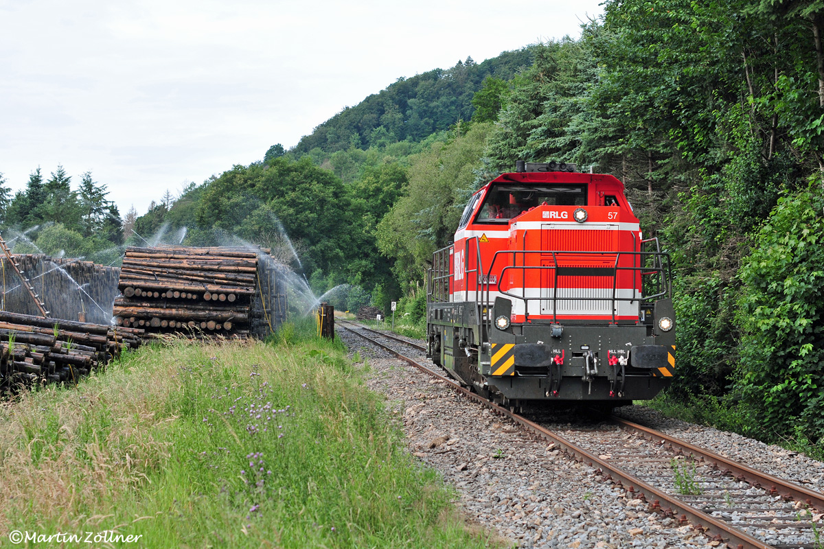 Ein Satz mit "x" ? Das war wohl nix ! – Am Samstag, den 04.07.2020 sollte der 5. Käferholzganzzug von Sundern aus Richtung Rumänien auf die Reise gehen. Nachdem der Wagenmeister den Eaos-Wagenzug wegen Mängeln nicht freigegeben hat, kommt RLG 57 unverrichteter Dinge am Egger-Nassholzlager bei Reigern Richtung Lokschuppen Neheim zurück. An diesem Fotostandpunkt benötigt man auch bei gutem Wetter einen Regenschirm – oder wird mit Wasser aus der Röhr geduscht.