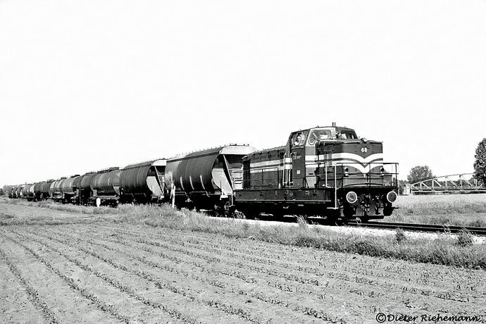 Gut zu tun hatte RLG 68 am Morgen des 22. Mai 1989 auf der Strecke nach Uentrop Süd. Dieter Riehemann nahm den langen Güterzug auf der Fahrt zum Werk DuPont in der Geithe auf, rechts ist ein Teil der sogenannten Kleinbahnbrücke der Strecke nach Lippborg ⁄ Soest über den Datteln-Hamm-Kanal zu sehen.