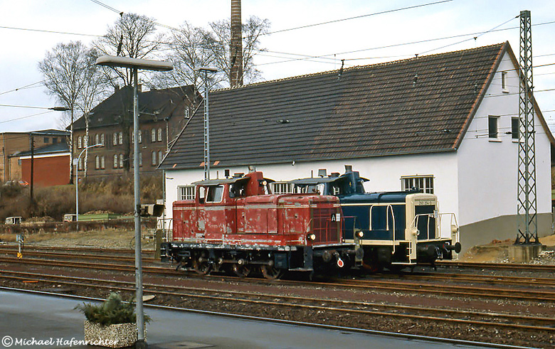 In den achtziger Jahren war das Aw Kassel noch für die Instandhaltung aller DB V 60 zuständig. Ausgebesserte und hauptuntersuchte Maschinen führten hier regelmäßig Werksprobefahrten bis nach Warburg durch. Michael Hafenrichter konnte am 15. Dezember 1980 die noch im "Tarnanstrich" befindliche Haltinger 260 001 sowie die farblich bereits fertiggestellte Plattlinger 260 204 im Pausenmodus gegenüber dem Warburger Empfangsgebäude aufnehmen.