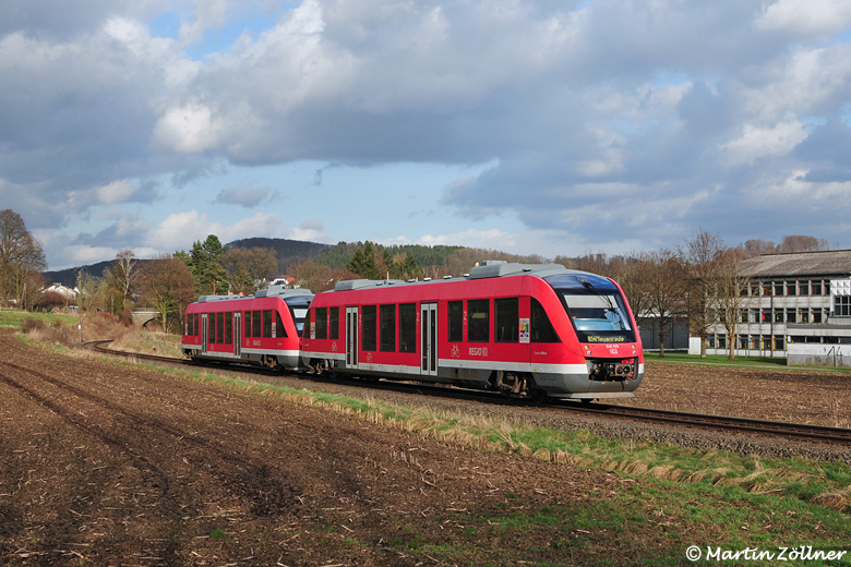 Von DB Regio Dortmund wurden zwei VT 640 für den Einsatz auf dem RE 57 nach Winterberg zu Fahrradwagen umgebaut (Stichwort "Ruhrtalradweg"). Somit als Anhang am VT 648 auf dem RE 57 gedacht, sind die beiden Exemplare am 30. März 2015 jedoch als Doppel auf der Hönnetalbahn für einen ausgefallenen VT 648 verplant. Am späten Nachmittag beschleunigen sie unter interessanter Wolkenkulisse aus Balve heraus zum nächten Halt in Garbeck.