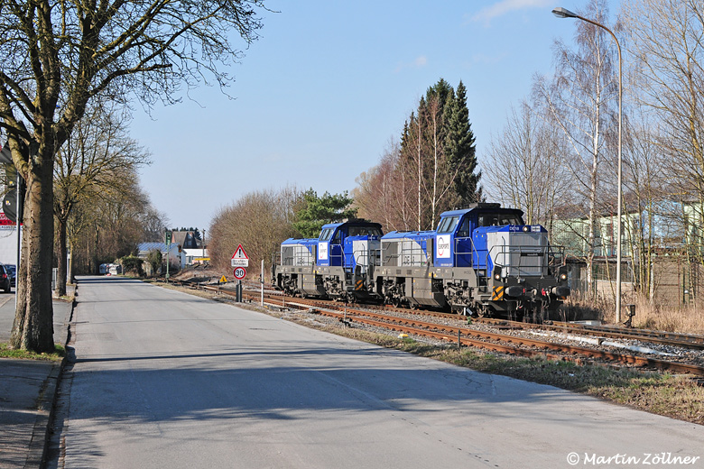 Am 09. März ist einer dieser Tage, und die beiden frankreichtauglichen DE 18 (u.a. Fahrpult auf der linken Seite) vom Frachtführer Europorte setzen am späten Nachmittag am BÜ Keplerstraße gerade vor den Abgangszug. Die führende 4185 008 fährt übrigens seit April 2024 für die nahegelegene Firma Stricker Rose Rail GmbH in Bönen.