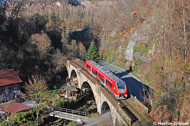 Am 29. Oktober 2018 wurde die Hönnetalbahn im Zuge der Linie RB 54 mit fast zwei Jahren Verspätung auf die neuen Fahrzeuge des Herstellers PESA umgestellt. Einer der wegen ihres charakteristischen Aussehens auch als "Regio-Hai" bezeichneten Fahrzeuge, hier der Zweiteiler 632 107, konnte zwei Wochen später am 17. November 2018 gen Neuenrade fahrend auf dem Hönneviadukt vor dem Uhu-Tunnel dokumentiert werden (Bild links).
