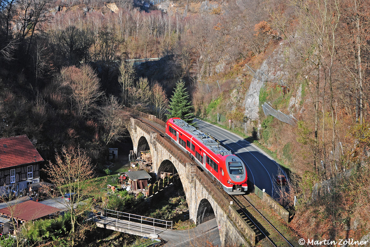 Satte 88 Jahre später kann man zwar dort immer noch ein Bahnbild anfertigen, jedoch reicht es gegenüber der historischen Aufnahme aufgrund des Bewuchses nur noch für einen ganz kleinen Hochkantbildauschnitt. Am 14. Mai 2025 rollt der mittägliche Schülerzug in Form von 632 106 (leider nicht wie planmäßig vorgesehen als Doppeleinheit) unter dem Fotografen hindurch nach wenigen Metern in den Binoler Tunnel (Bild rechts).