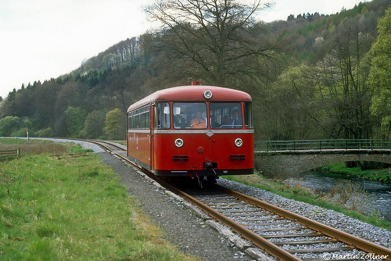 Im Rahmen einer Fototour der Eisenbahnfreunde Witten und der DGEG kam dessen Schweineschnäuzchen VT 2 am 06. September 2003 auf der Röhrtalbahn zum Einsatz. Am Forsthaus Reigern konnte der Minitriebwagen in diese kleine Lücke im Baumbestand bildlich eingepasst werden. Fahrt als Nt 102 von Neheim-Hüsten nach Sundern.